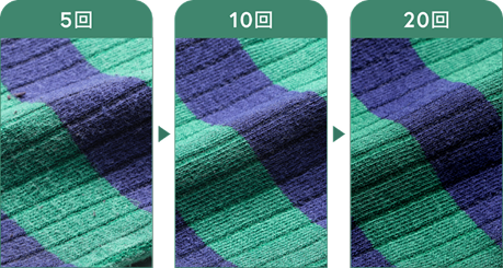 回数を重ねるほどに毛玉や毛羽立ちが除去され、なめらかな質感になり、毛玉や毛羽立ちによる色褪せが軽減しています。